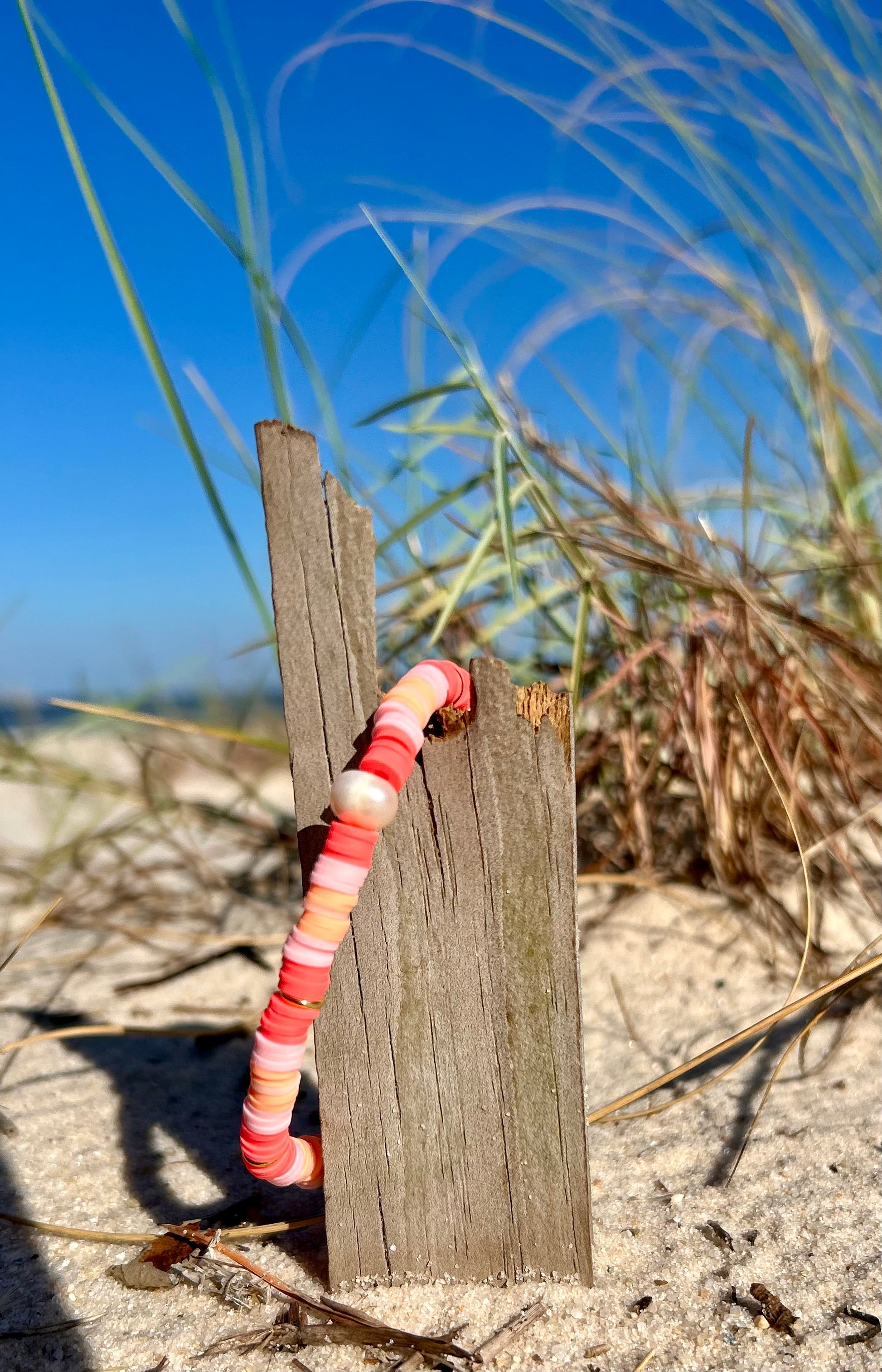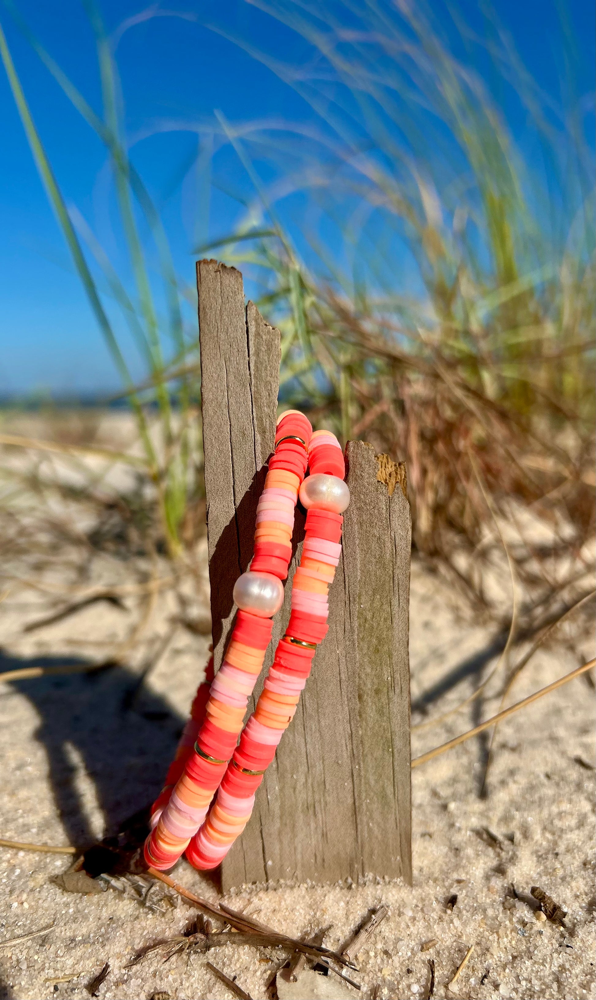 Bathed in the hues of a fading sunset, Celestial Coral captures the essence of summer’s final sigh. Radiant coral, blush, and soft peach beads swirl like whispers of sunlight over tide-kissed sand, each accented by a luminous freshwater pearl — a symbol of intuition, serenity, and ocean-born magic.