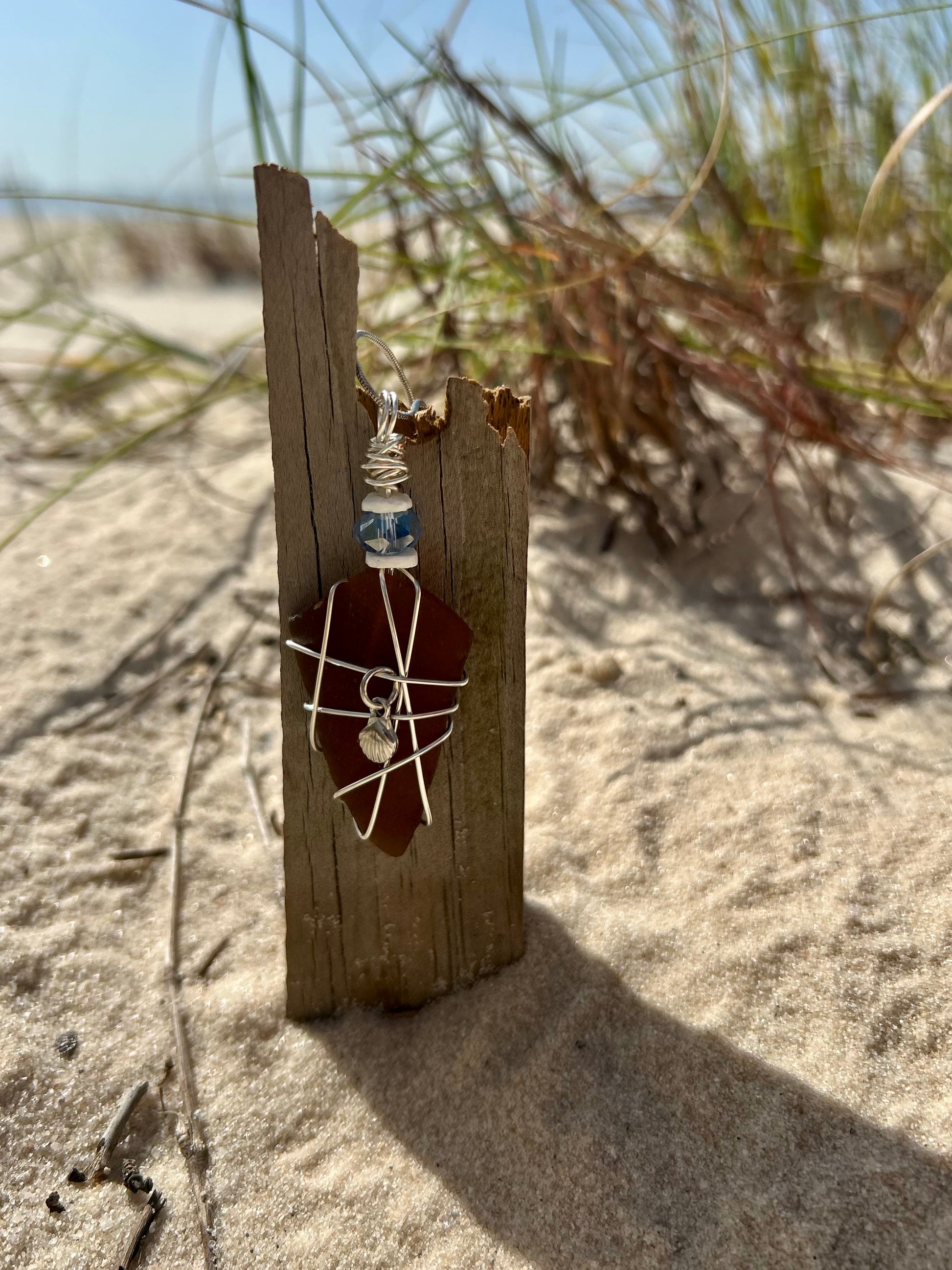 This radiant amber sea glass, softened by tides and time, glows with the warmth of golden light and the quiet mystery of coastal twilight. Hand-wrapped in shimmering silver wire, it is crowned with a delicate seashell charm and a sparkling blue bead — like a drop of ocean sky caught within flame.