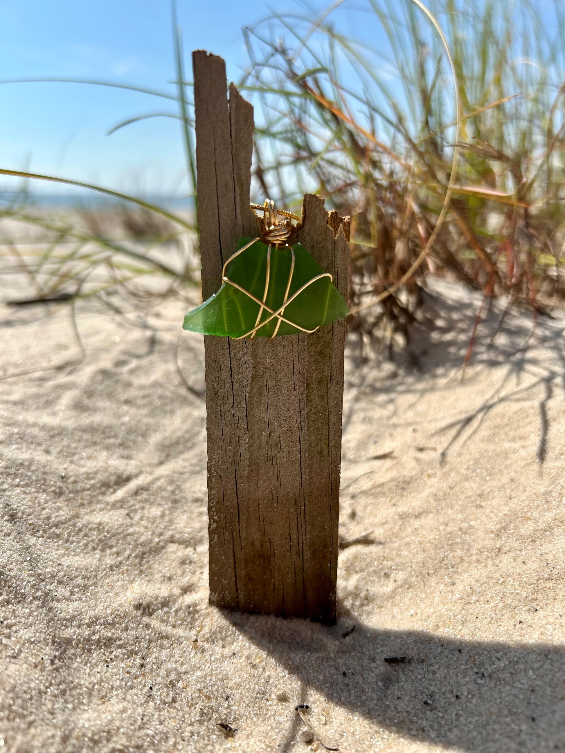 This vivid green sea glass talisman was shaped by waves, kissed by salt winds, and gathered from our local shores. Wrapped in golden wire, it shimmers with the untamed energy of a sea sprite — radiant, earthy, and just a little wild.