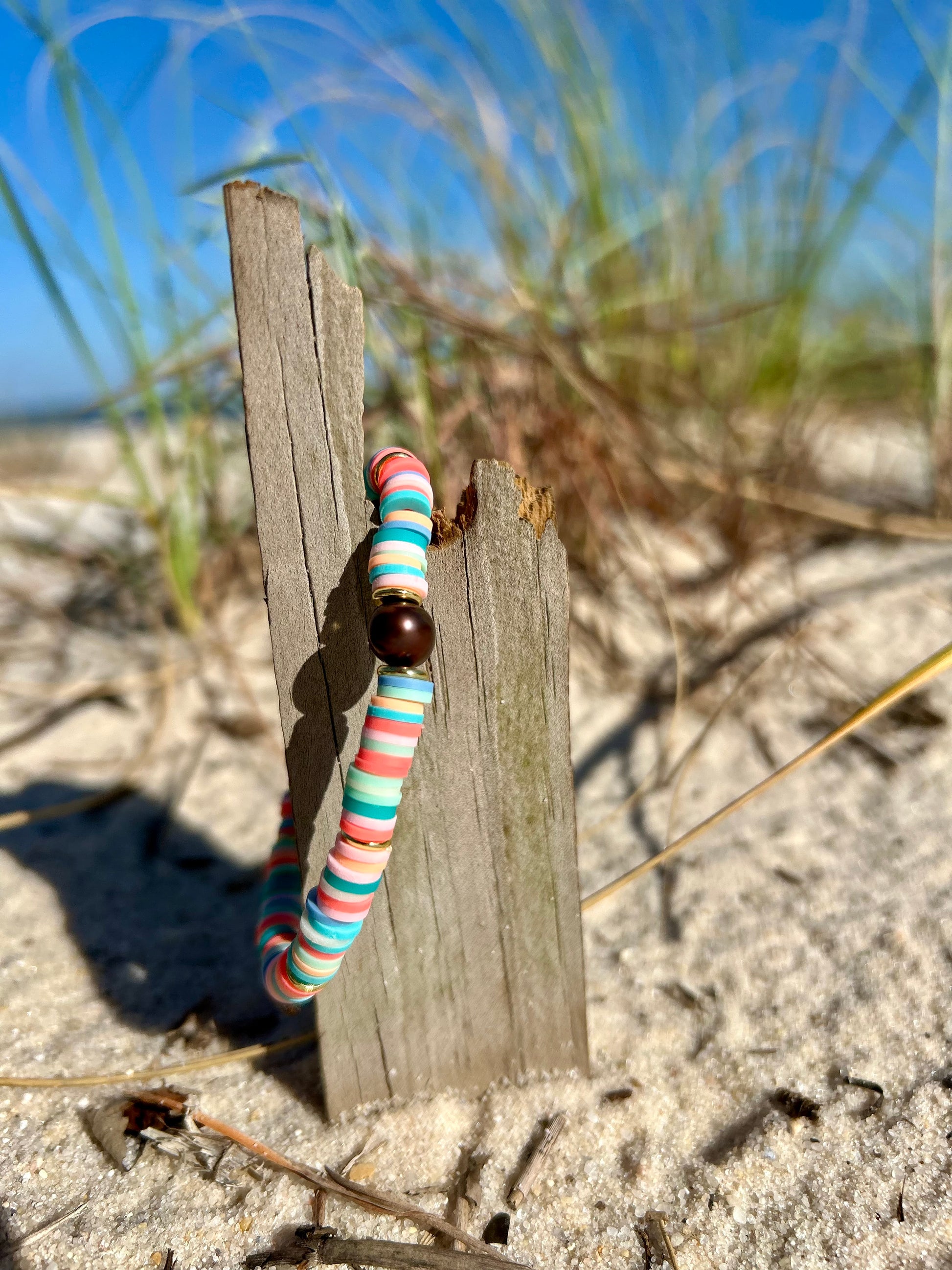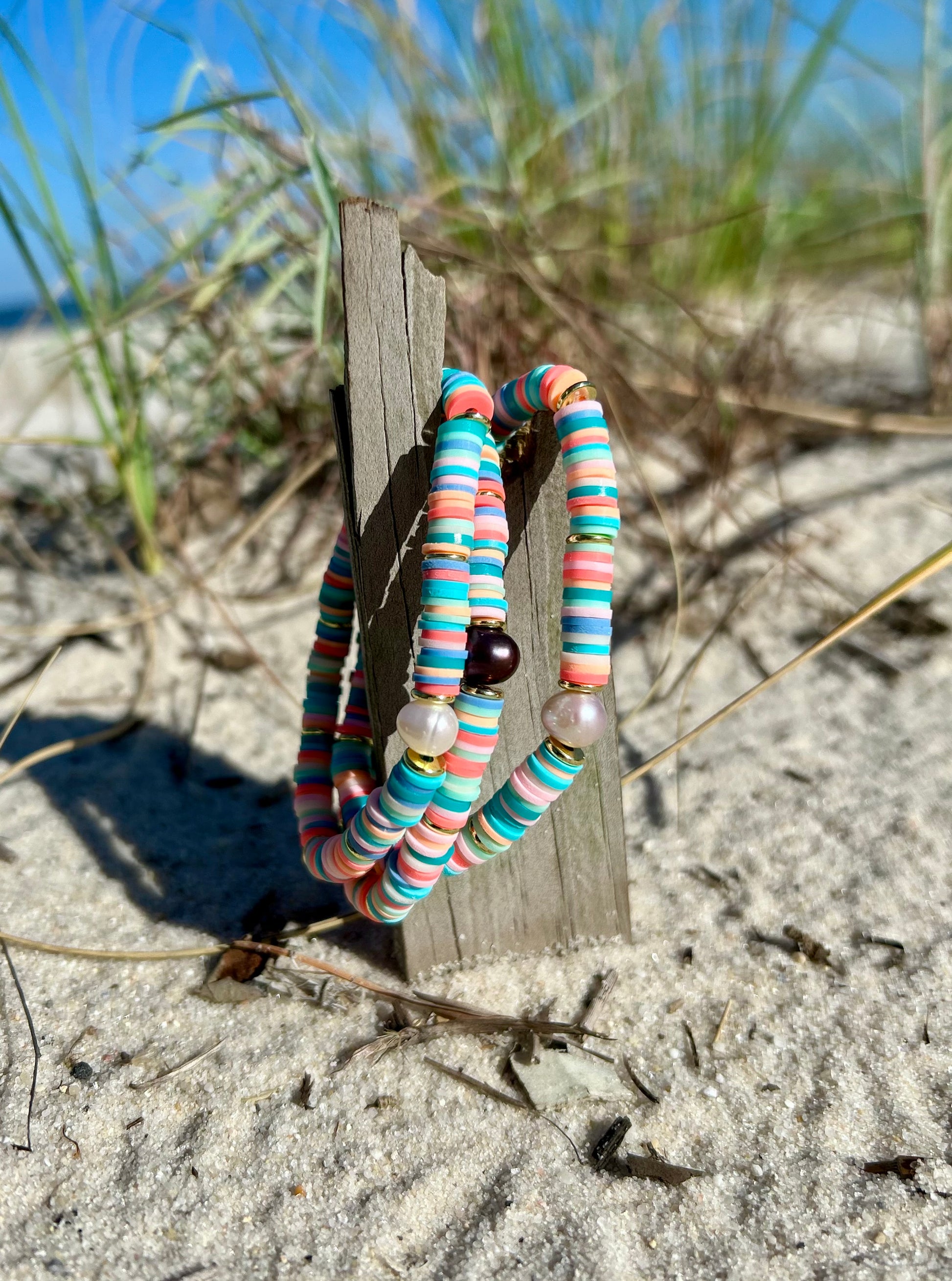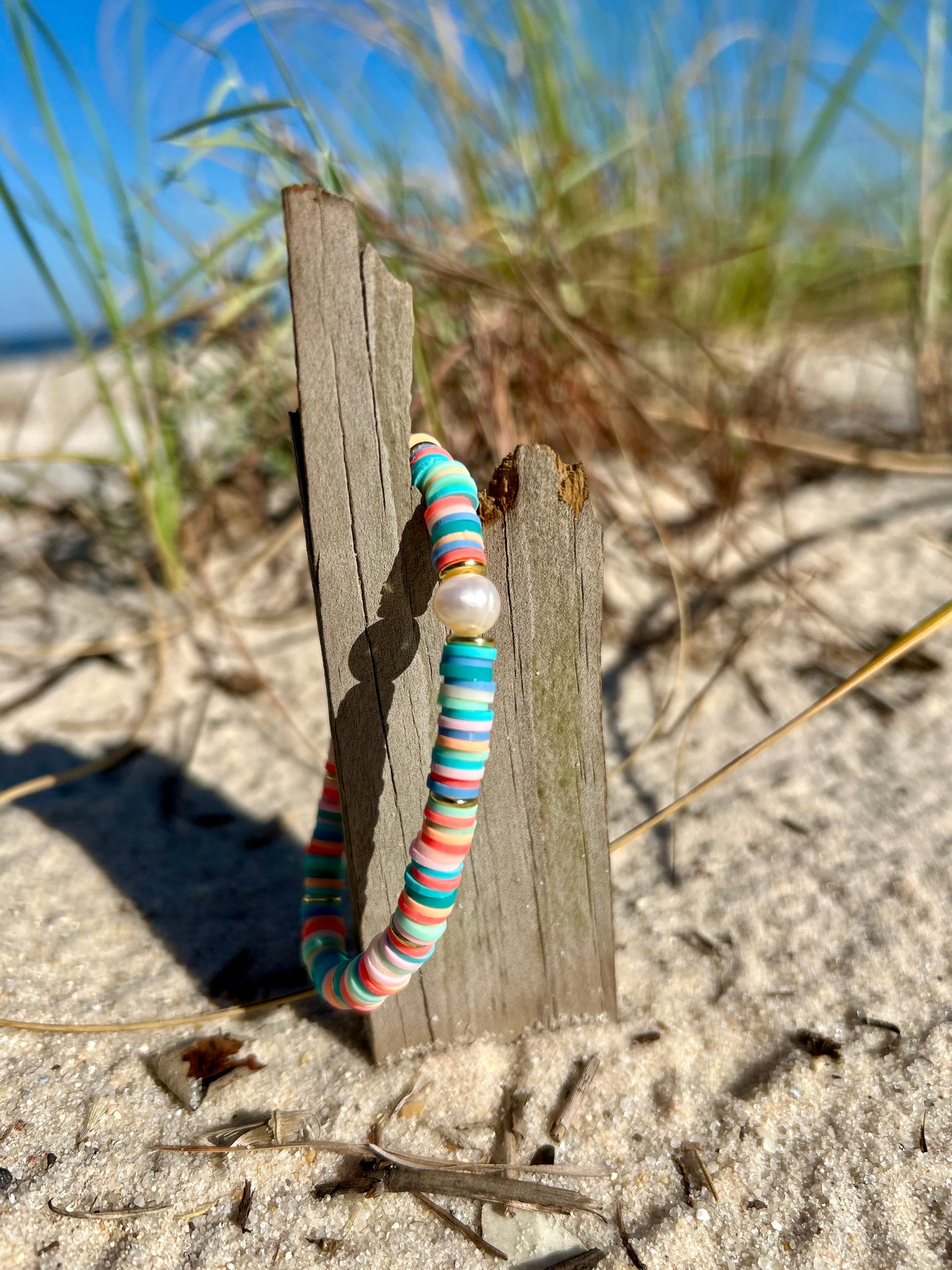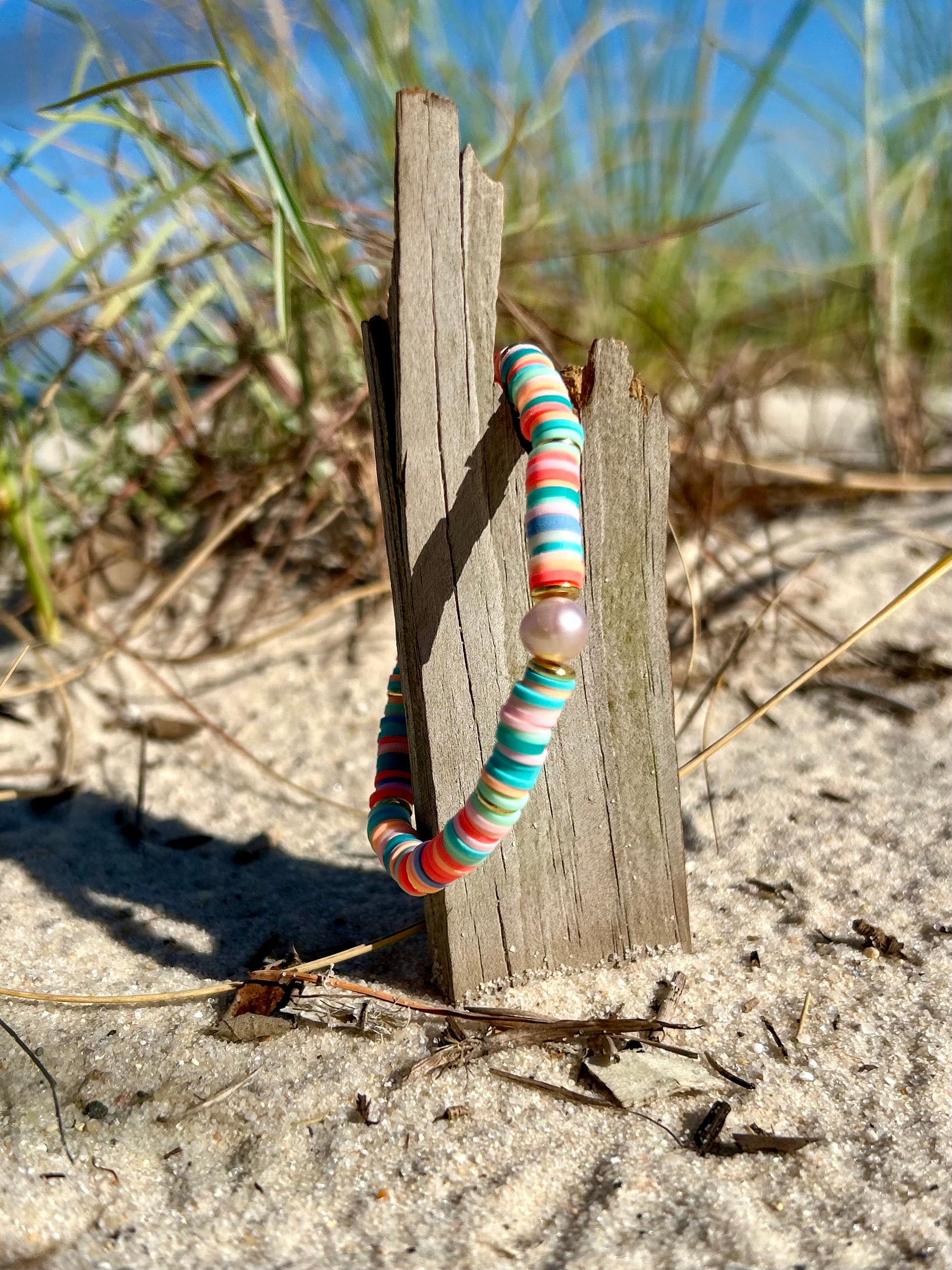 Each Solar Siren bracelet is a spellbound strand of vibrant heishi beads, crowned with a single freshwater pearl—each one glimmering with its own quiet magic. Wear one as a charm of light, tide, and transformation.
